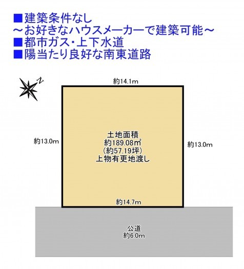 詳しくは詳細ページをご覧ください。写真充実 区画図有 接道6m以上 上下水道完備 角部屋更新日:2025年 11月18日