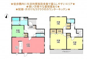 - システムキッチン、カウンターキッチン、シャンプードレッサー、洗浄便座、浴室乾燥機、ウォークインクローゼット、モニタ付インターホン、ペット可、床下収納、トイレ2箇所、角部屋