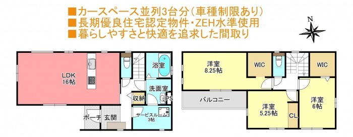 - システムキッチン、カウンターキッチン、シャンプードレッサー、洗浄便座、浴室乾燥機、追い焚き、ウォークインクローゼット、モニタ付インターホン、ペット可、駐車場2台分、駐車場3台分、トイレ2箇所