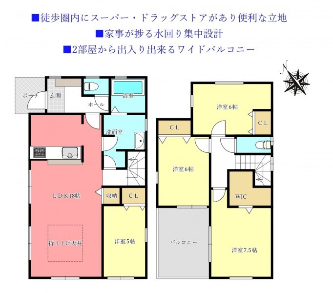 - システムキッチン、複層ガラス、ウォークインクローゼット、モニタ付インターホン、ペット可、駐車場2台分、床下収納、トイレ2箇所