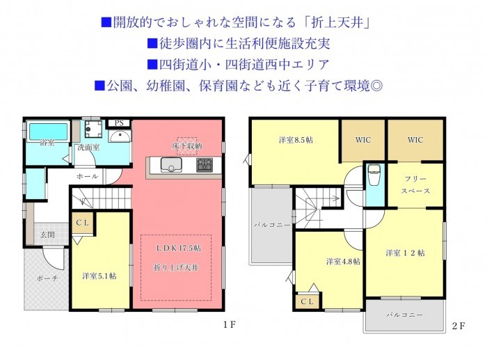 - システムキッチン、カウンターキッチン、浴室乾燥機、複層ガラス、ウォークインクローゼット、モニタ付インターホン、ペット可、駐車場2台分、床下収納、トイレ2箇所