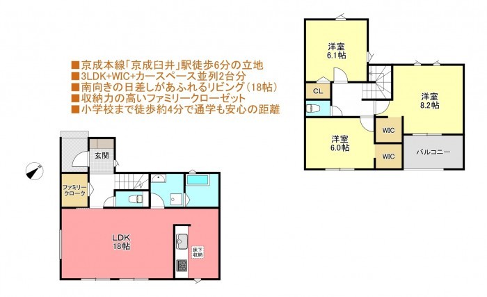 - システムキッチン、洗浄便座、浴室乾燥機、複層ガラス、ルーフバルコニー、ウォークインクローゼット、モニタ付インターホン、ペット可、駐車場2台分、床下収納、トイレ2箇所