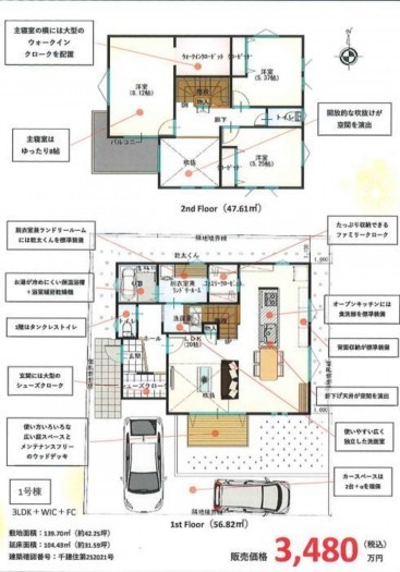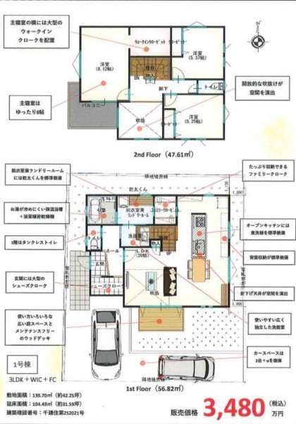 - システムキッチン、食器洗浄乾燥機、洗浄便座、浴室乾燥機、追い焚き、ウォークインクローゼット、モニタ付インターホン、ペット可、駐車場2台分、床下収納、トイレ2箇所