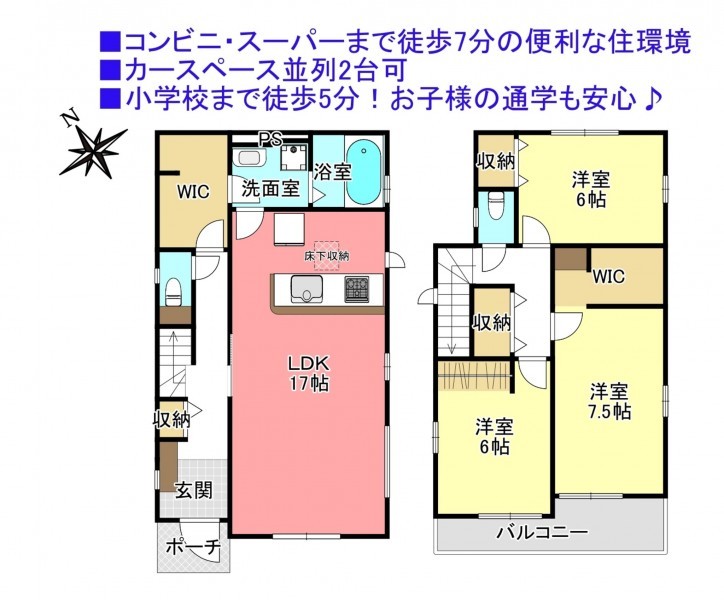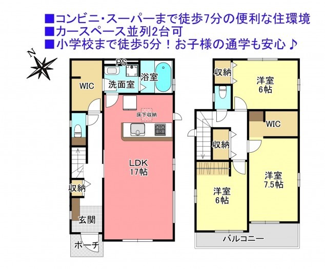 - システムキッチン、洗浄便座、浴室乾燥機、追い焚き、ウォークインクローゼット、モニタ付インターホン、ペット可、1BOX駐車可、駐車場2台分、床下収納、トイレ2箇所