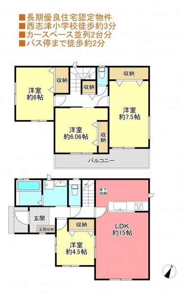 - システムキッチン、カウンターキッチン、ペット可、駐車場2台分、床下収納、トイレ2箇所