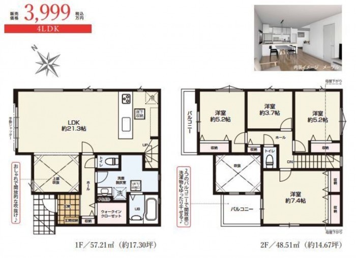 - システムキッチン、食器洗浄乾燥機、追い焚き、ウォークインクローゼット、モニタ付インターホン、ペット可、駐車場2台分、床下収納、トイレ2箇所